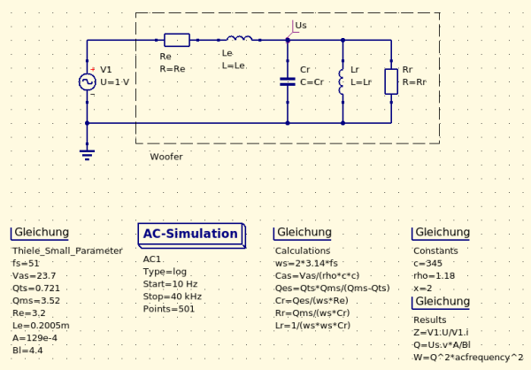 This is the schematic for a classical Thiele-Small simulation. Note that all simulation parameters, constants, user changeable variables etc. are visible in the schematic and therefor automatically included in the documentation. It is possible to define more than one simulation per schematic.